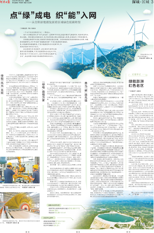 澎湃綠電助推綠色產(chǎn)業(yè)。圖為萬(wàn)華生態(tài)集團(tuán)禾香生態(tài)板材生產(chǎn)線(劉宏冰 攝) 當(dāng)前,我國(guó)進(jìn)入新的發(fā)展階段,放眼河南,各地都在加快布局新能源發(fā)展,推動(dòng)產(chǎn)業(yè)升級(jí)。在比亞迪等新能源工廠導(dǎo)入、上汽新工廠建設(shè)助推下,鄭州新能源汽車產(chǎn)銷實(shí)現(xiàn)躍遷式增長(zhǎng),首次躋身國(guó)內(nèi)新能源汽車產(chǎn)量前十名;南陽(yáng)市政府印發(fā)若干政策措施,支持淅減、飛龍、眾德等汽車零部件企業(yè)實(shí)現(xiàn)產(chǎn)品從配套燃油汽車向新能源汽車轉(zhuǎn)變;焦作市加快建設(shè)中部新能源材料城,龍佰集團(tuán)鈦白粉產(chǎn)能規(guī)模全球第一,多氟多六氟磷酸鋰產(chǎn)銷量全球第一…… 在這場(chǎng)轉(zhuǎn)型中,信陽(yáng)勇當(dāng)“碳”路先鋒。作為國(guó)家首批碳達(dá)峰試點(diǎn)城市,信陽(yáng)正積極探索降碳與發(fā)展協(xié)同的信陽(yáng)經(jīng)驗(yàn)。豫東南高新區(qū)前瞻布局零碳智慧產(chǎn)業(yè)園區(qū),光儲(chǔ)充檢智能超充站、大灣區(qū)低碳創(chuàng)新示范園等項(xiàng)目加速落地。“零碳”已成為信陽(yáng)吸引高端要素的“金字招牌”。華為、360、百度、愛奇藝等數(shù)字巨頭紛紛落子,布局算力中心、培育大模型產(chǎn)業(yè),加快構(gòu)建“綠電+綠算”生態(tài)圈。 信陽(yáng)馭“風(fēng)”追“光”的實(shí)踐,為河南加速能源結(jié)構(gòu)轉(zhuǎn)型、培育新質(zhì)生產(chǎn)力提供了強(qiáng)勁推力。綠能澎湃,新質(zhì)生長(zhǎng),中原大地正以信陽(yáng)等地的先行實(shí)踐為引擎,堅(jiān)定邁向綠色低碳的高質(zhì)量發(fā)展新征程。 記者手記:綠能澎湃紅色老區(qū) 河南日?qǐng)?bào)客戶端記者 劉宏冰 越野車轟鳴著攀上黃柏山棋盤石,我看到24座“馭風(fēng)巨人”傲立山脊,百米長(zhǎng)的葉片劃破長(zhǎng)空,發(fā)出沉穩(wěn)有力的呼嘯。這風(fēng),已不再是山間過客,而是點(diǎn)亮老區(qū)新生的能量之源。 “自從這些‘大家伙’立起來(lái),大山里就沒停過電啦!”生于斯、長(zhǎng)于斯,在大山里守了30多年的黃柏山林場(chǎng)場(chǎng)長(zhǎng)丁大軍感嘆道。