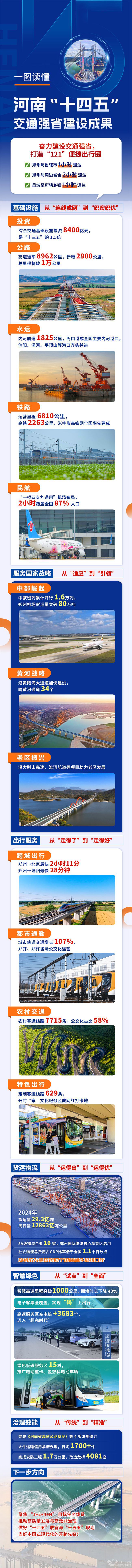 人民網(wǎng)鄭州10月14日電 (程明輝)跨城出行“拎包走”、都市通勤“像串門”、個(gè)性出行“特色足”……10月13日,河南省舉行“十四五”系列主題新聞發(fā)布會(huì),會(huì)上披露,“十四五”以來,河南交通強(qiáng)省建設(shè)邁出堅(jiān)實(shí)步伐,一個(gè)更高效、更智能、更暖心的中原綜合立體交通網(wǎng)正逐步成型。 “鄭州與省轄市1小時(shí)通達(dá)、鄭州與周邊省會(huì)城市2小時(shí)通達(dá)、縣城至所轄鄉(xiāng)鎮(zhèn)1小時(shí)通達(dá),全省‘121’便捷出行格局基本形成。”河南省交通運(yùn)輸廳黨組書記、廳長付磊介紹,“十四五”期間,河南綜合交通基礎(chǔ)設(shè)施投資將達(dá)8400億元,是“十三五”的1.5倍,全省綜合交通網(wǎng)總規(guī)模達(dá)29.2萬公里。 公路方面,高速公路通車?yán)锍桃堰_(dá)8962公里,“十四五”新增里程超2900公里,年底將突破1萬公里,90%以上的縣邁入“雙高速”時(shí)代。普通干線公路新改建4500公里,實(shí)現(xiàn)重要節(jié)點(diǎn)二級(jí)及以上公路連通。農(nóng)村公路也成績斐然,新改建4萬公里,“四好農(nóng)村路”全國示范縣達(dá)23個(gè)。 水運(yùn)方面,河南內(nèi)河航道里程達(dá)1825公里,周口港成為全國內(nèi)河主要港口之一,2024年全省完成港口吞吐量6085萬噸、集裝箱10.9萬標(biāo)箱,比“十三五”末分別增長1倍、12倍。 鐵路民航同樣蓬勃發(fā)展,鐵路運(yùn)營里程達(dá)6810公里,其中高速鐵路2263公里,率先建成“米”字形高鐵網(wǎng)。全省形成“一樞四支九通用”機(jī)場布局,航空運(yùn)輸2小時(shí)內(nèi)覆蓋全國87%以上人口。 在服務(wù)重大戰(zhàn)略方面,河南積極作為。“鄭州-盧森堡”“鄭州-吉隆坡”雙樞紐發(fā)力,中歐班列(鄭州)累計(jì)開行16000列,鄭州航空港區(qū)建成內(nèi)陸首個(gè)國際公路運(yùn)輸集結(jié)中心。同時(shí),沿黃陸海大通道加快建設(shè),跨黃河運(yùn)輸通道達(dá)34個(gè),沿大別山高速等項(xiàng)目建成通車,為老區(qū)發(fā)展注入新動(dòng)能。 便捷群眾出行也是河南交通發(fā)展的重點(diǎn)?绯浅鲂“拎包走”,鄭州到北京最快2小時(shí)11分,到洛陽高鐵28分鐘直達(dá)。都市通勤“像串門”,城市軌道交通運(yùn)營里程增加220公里,鄭開、鄭許城際公交化運(yùn)營,通勤成本降低近一半。農(nóng)村交通“有保障”,開通農(nóng)村客運(yùn)線路7715條,公交化運(yùn)營占比58%。此外,全省新增定制客運(yùn)線路629條,“交通+醫(yī)療”等特色服務(wù)不斷創(chuàng)新。 在貨物運(yùn)輸方面,河南正由“內(nèi)陸腹地”向“物流樞紐”加速轉(zhuǎn)變。2024年全省累計(jì)完成貨運(yùn)量29.3億噸、貨運(yùn)周轉(zhuǎn)量12863億噸公里,比“十三五”末分別增長34%、48%。郵政快遞也進(jìn)階提質(zhì),2024年完成郵政行業(yè)業(yè)務(wù)收入727.3億元、快遞業(yè)務(wù)量90.5億件,比“十三五”末分別增長79%、192%。 智慧綠色發(fā)展同樣亮點(diǎn)紛呈。智慧高速里程突破1000公里,智慧擴(kuò)容試點(diǎn)路段改造后擁堵總時(shí)長有望下降40%。綠色交通方面,城市公交基本實(shí)現(xiàn)新能源化,全省高速公路服務(wù)區(qū)新增充電樁3683個(gè),邁入“超充時(shí)代”。 一圖讀懂河南“十四五”交通強(qiáng)省建設(shè)成果