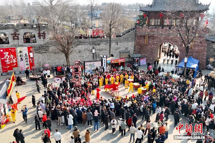 2月17日,農(nóng)歷正月初一,被譽為“微短劇之村”河南登封袁橋古村吸引眾多游客前來打卡體驗。據(jù)了解,自2024年以來,已有超過50部微短劇在此取景拍攝。圖為民俗表演吸引游客圍觀。(無人機照片) 劉楊迪 攝