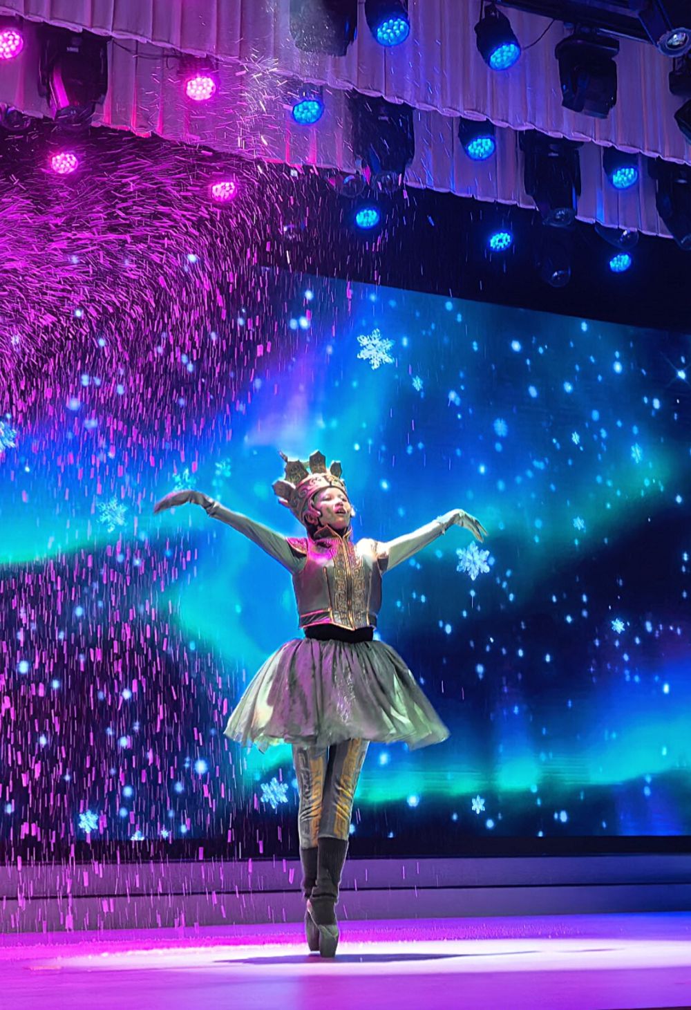 這是河南博物院首部原創(chuàng)文物歌舞劇《國寶歡樂耶》演出現(xiàn)場。新華社記者 袁月明 攝 據(jù)了解,整場演出時長約45分鐘,共分為“國寶之行”“水之旅”“雪之境”“塵之光”“文明之守”五個部分,通過多元音樂搭配特色舞蹈,呈現(xiàn)每位“文物主角”的獨特氣質(zhì)與文化內(nèi)涵。 “比如蓮鶴方壺相關(guān)段落,我們采用了芭蕾這一藝術(shù)形式,以此展現(xiàn)文物本身的靈動姿態(tài)。”原娜說,“再比如賈湖骨笛相關(guān)段落,幕間音樂就是用骨笛吹奏的,帶領(lǐng)觀眾一起聆聽遠(yuǎn)古的回響。” 值得一提的是,該歌舞劇打破了傳統(tǒng)觀演邊界,構(gòu)建了獨特的沉浸式互動體系。 “我們綜合采用了多種視覺技術(shù)手段,打造出虛實交織、身臨其境的奇幻場景。同時,表演中還設(shè)置多重趣味互動環(huán)節(jié),讓演員從‘臺上’走到‘臺下’,讓觀眾由‘旁觀’變?yōu)?lsquo;入戲’,深度參與劇情推進(jìn)。”原娜說。