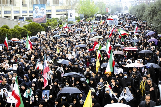 3月20日,在伊朗首都德黑蘭,人們參加伊朗情報(bào)部長伊斯梅爾·哈提卜及其家人的遺體告別儀式。